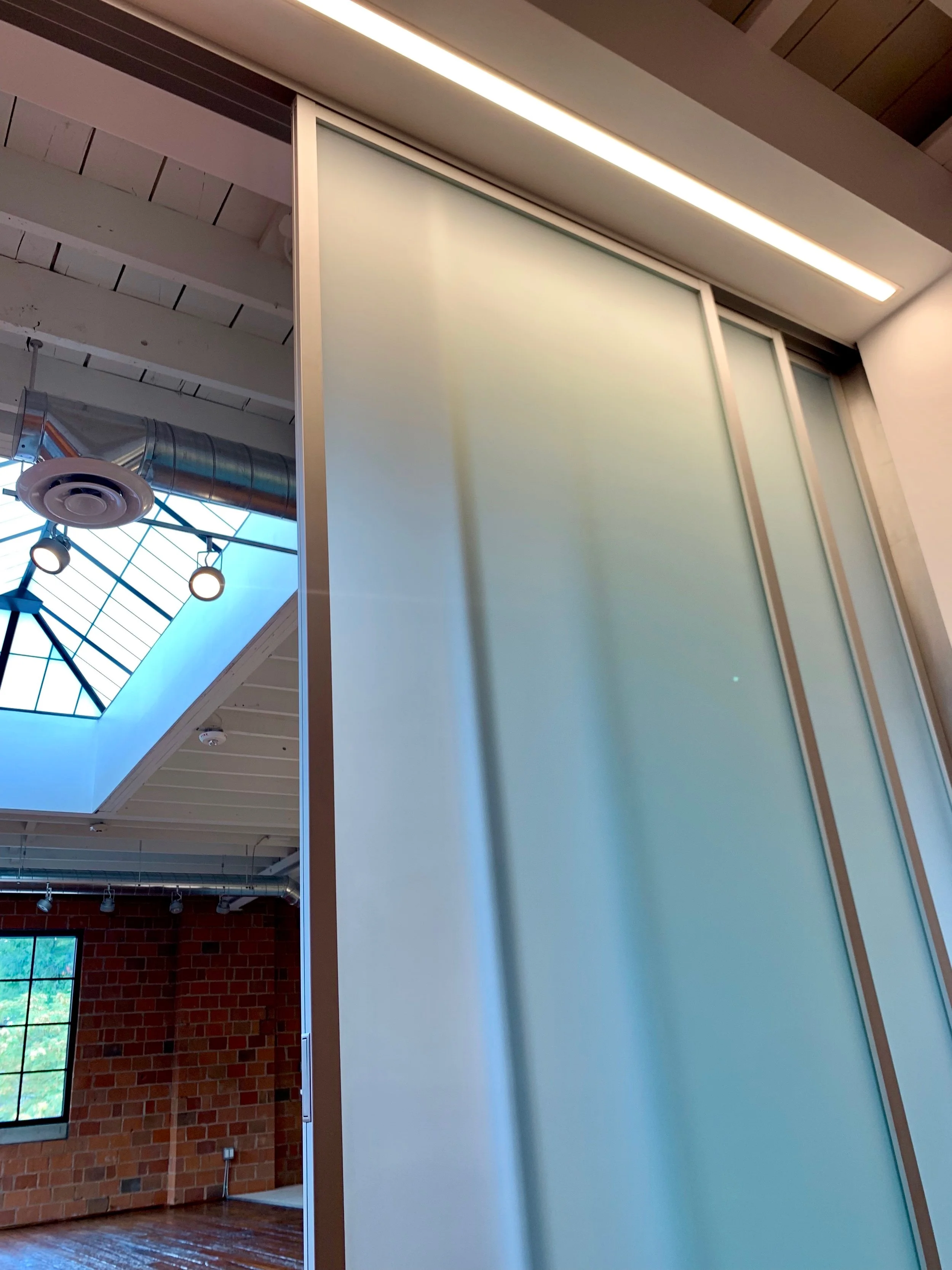 Sandblasted walls throughout the space, open timber ceilings, large operable glass windows, aluminum architectural trim