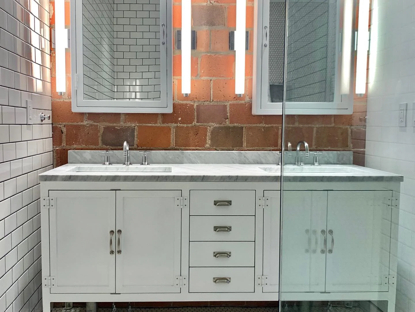 Metal pharmacy style bathroom casework, Carrara marble counters, floor-to-ceiling ceramic tiles, built-in mirrored medicine cabinets